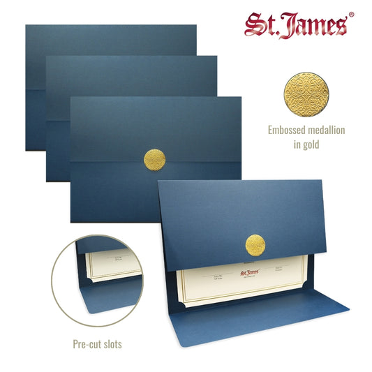St. James® Elite™ Medallion Fold Certificate Holders, Navy Blue Linen with Gold Medallion, Pack of 5, 83534