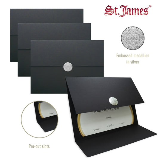 St. James® Elite™ Medallion Fold Certificate Holders, Black Linen with Silver Medallion, Pack of 5, 83566