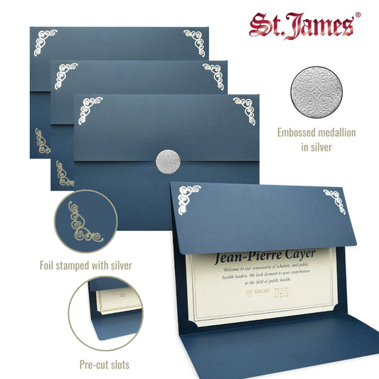 St. James® Elite™ Medallion Fold Certificate Holders, Linen, Navy Blue with Silver Medallion, Pack of 5, 83536