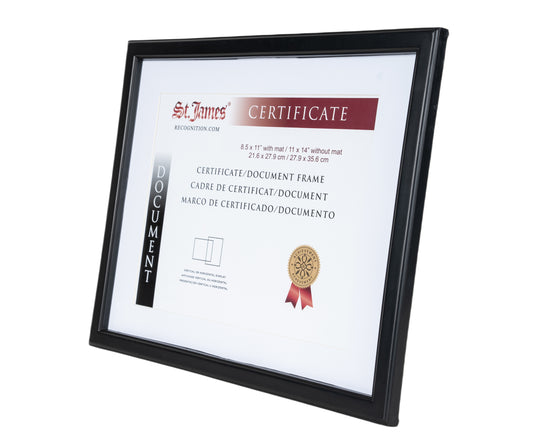 St. James® Certificate/Document/Diploma Frame, 8.5x11" with Mat or 11x14" without Mat, Black, 83918
