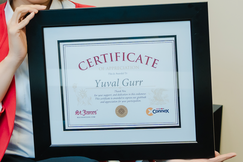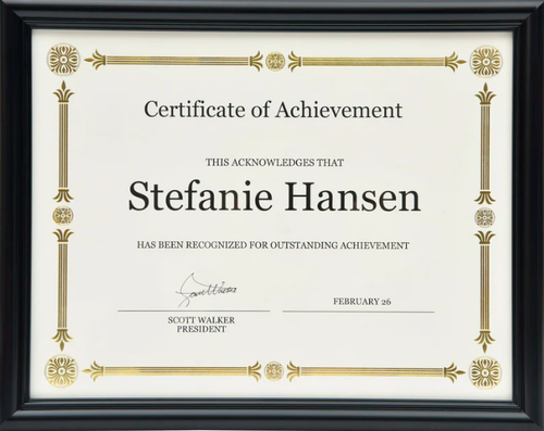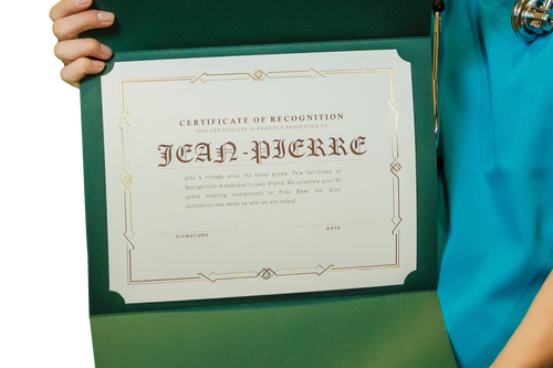 We print the recipient's name on the certificate, using the list of recipients you provide, to create a unique and meaningful recognition piece.